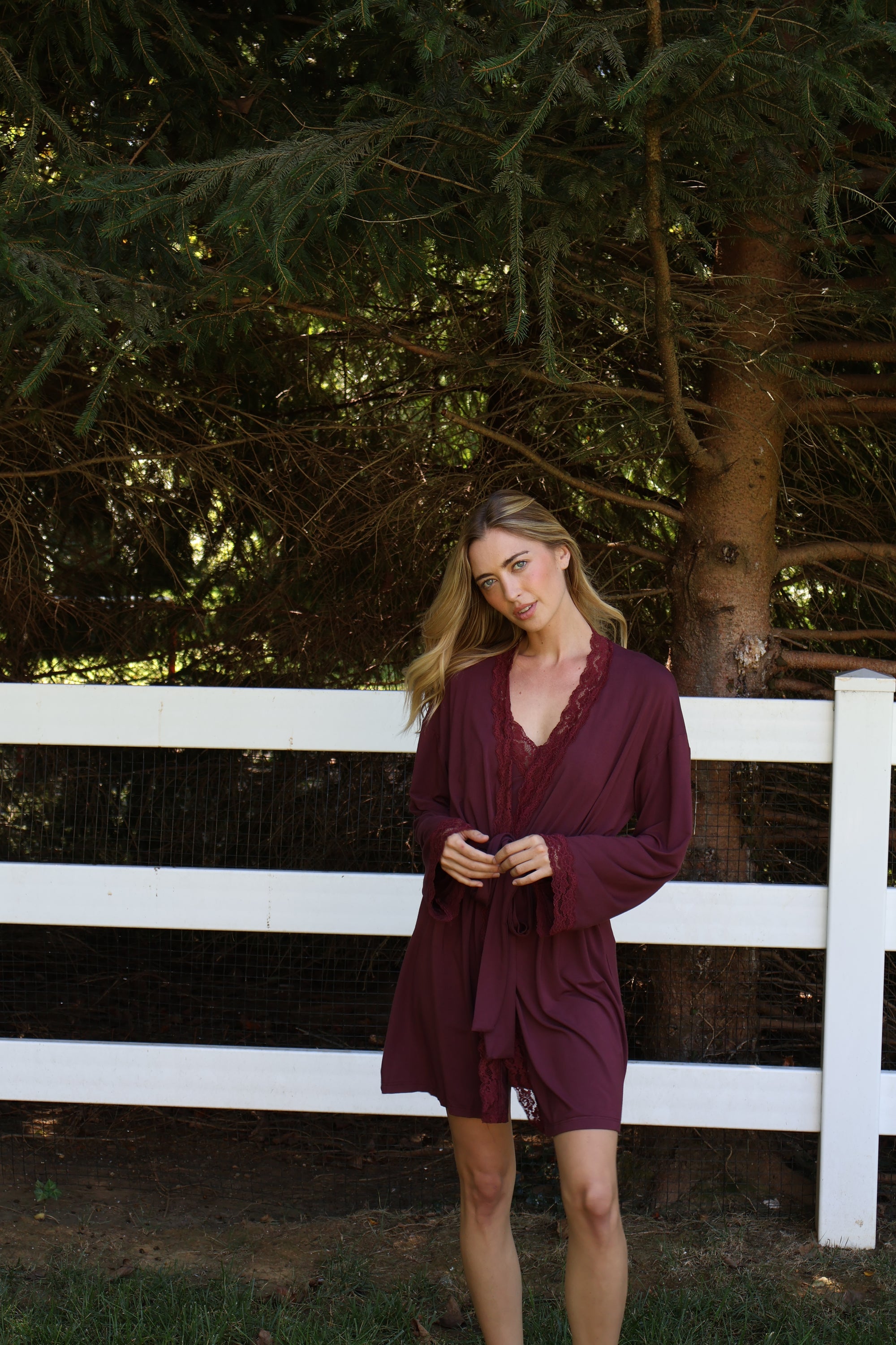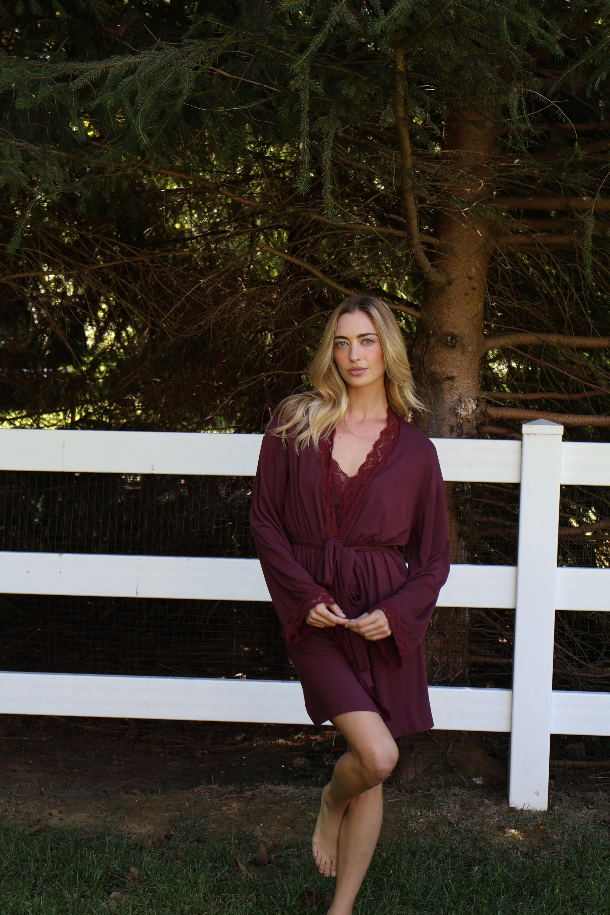 Bamboo Lace Trim Short Robe in Merlot