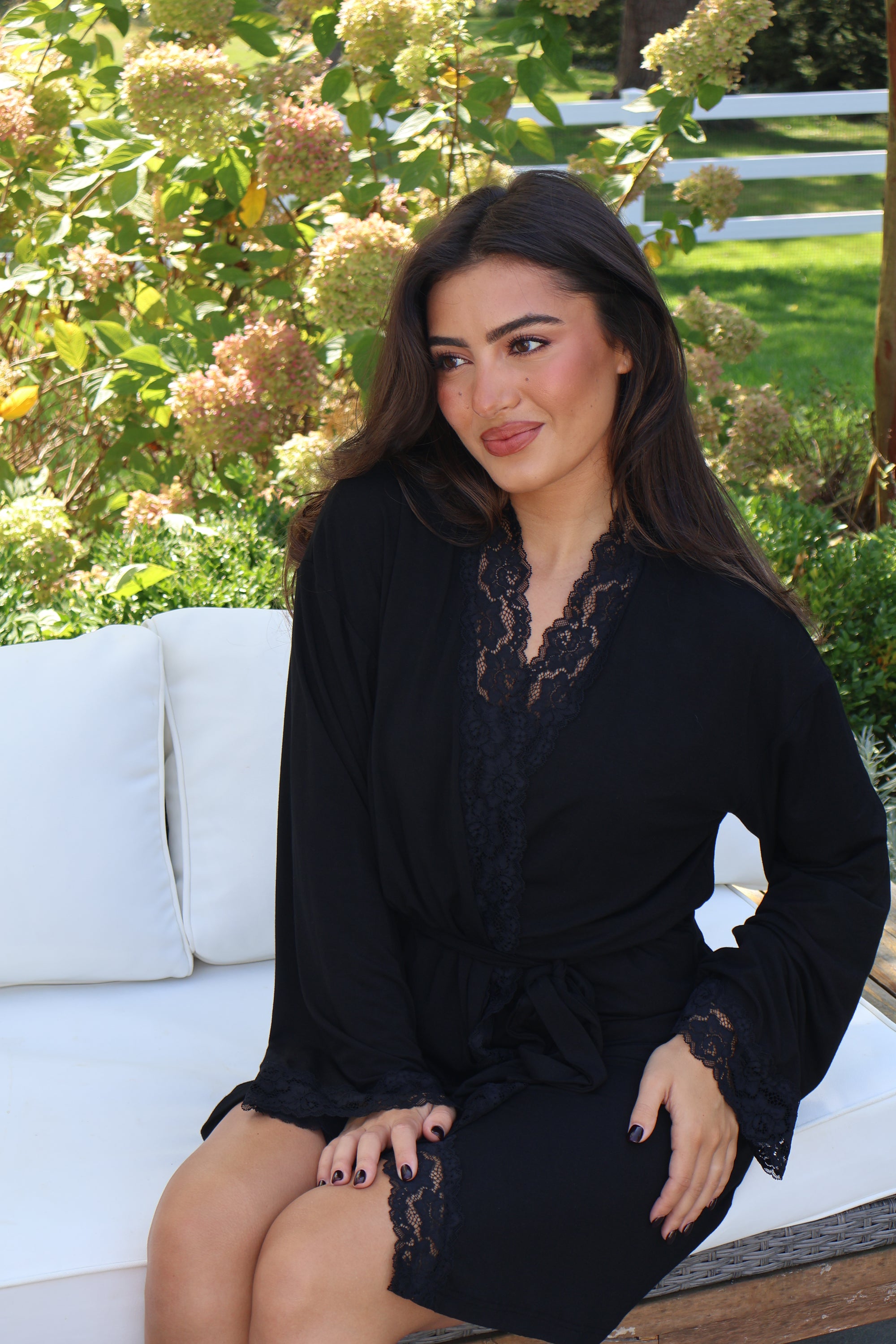 Bamboo Lace Trim Short Robe in Noir